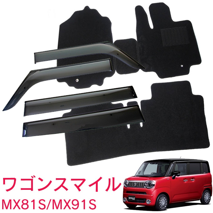 スズキ ワゴンRスマイル MX81S MX91S 全グレード適合 令和3年9月~超お得な3点セット 純正型 サイドバイザー&フロアマット【黒】&ナンバーフレーム 1台分セット【実車フィッティング済】